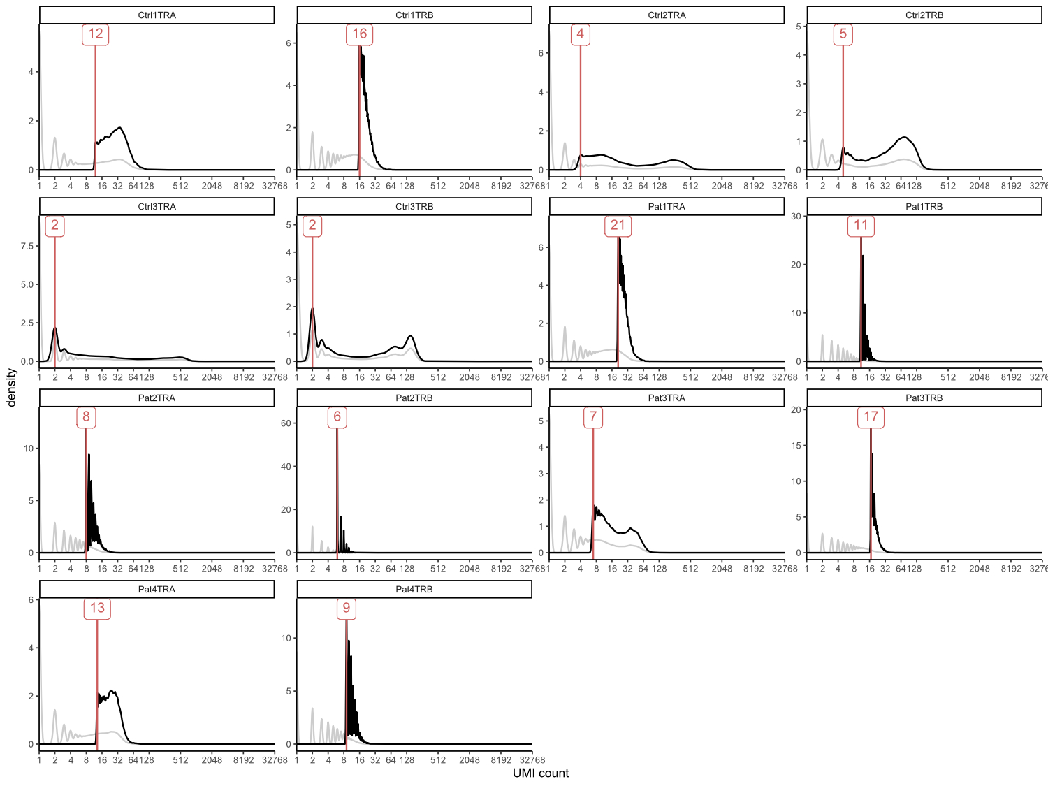 Figure S1 Unique molecular identifier coverage plots showing subsampling impact. Coverage of total reads is shown in grey, coverage after subsampling in black, resulting thresholds to subsample to equal number of 13,139 sequences are indicated in red. Ctrl3_TRA was used as reference because of the lowest number of initial reads and threshold for this sample was set to 2 in order to remove singletons.