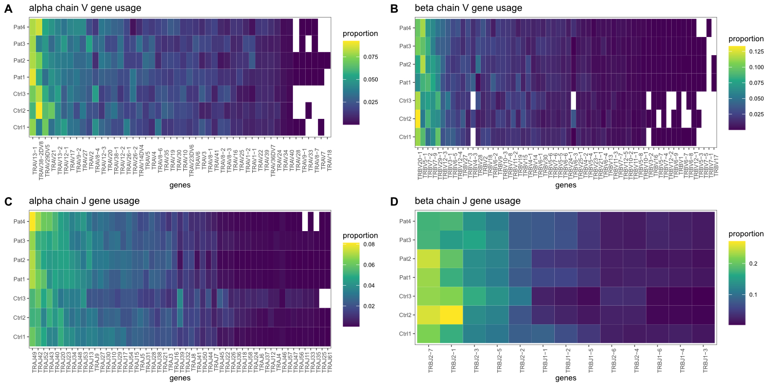 Non-productive sequences containing stop codons or out-of-frame rearrangements were removed for repertoire analysis (7.6% and 15% of all clonotypes in the immune profiler dataset and the subsampled dataset, respectively). As repertoire diversity readout, the Shannon diversity index and Rényi diversity profiles were calculated based on the clonal fraction of sequences using the vegan R package [13]. PCA was performed with the prcomp function, inputting V and J gene proportions of both combined clonal chains respectively. PCA plots were created using the factoextra R package [14]. Statistical analysis and plotting were performed in the R environment [15] using ggplot and cowplot packages [16, 17]. For pairwise comparisons between groups, a Wilcoxon test was performed.