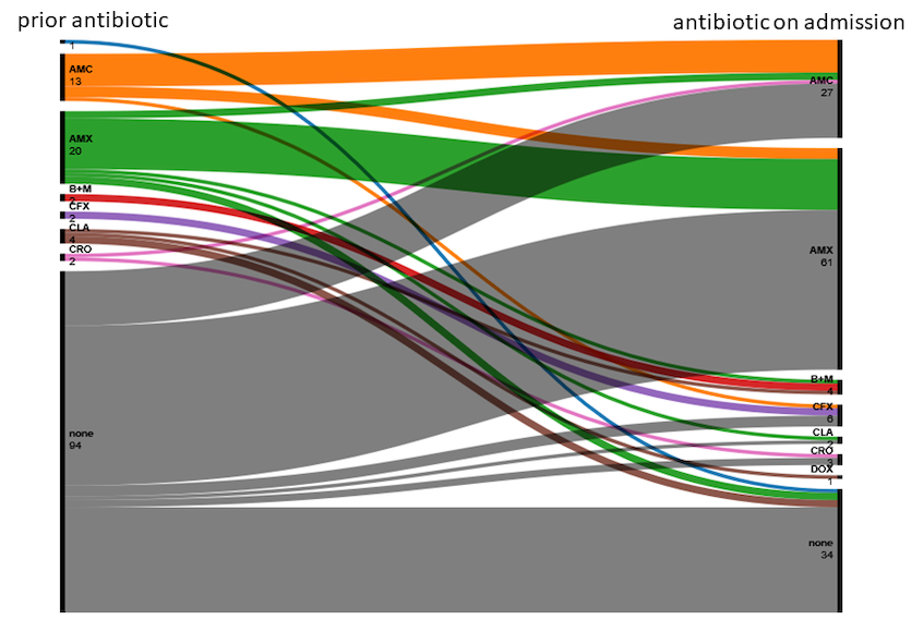 Figure 1 Alluvial plot of antibiotic treatment prior to admission and on admission. No label: unknown; AMC: amoxicillin + clavulanic acid; AMX: amoxicillin; BL + M: beta-lactam + macrolide; CFX: cefuroxime; CLA: clarithromycin; CRO: ceftriaxone; DOX: doxycycline