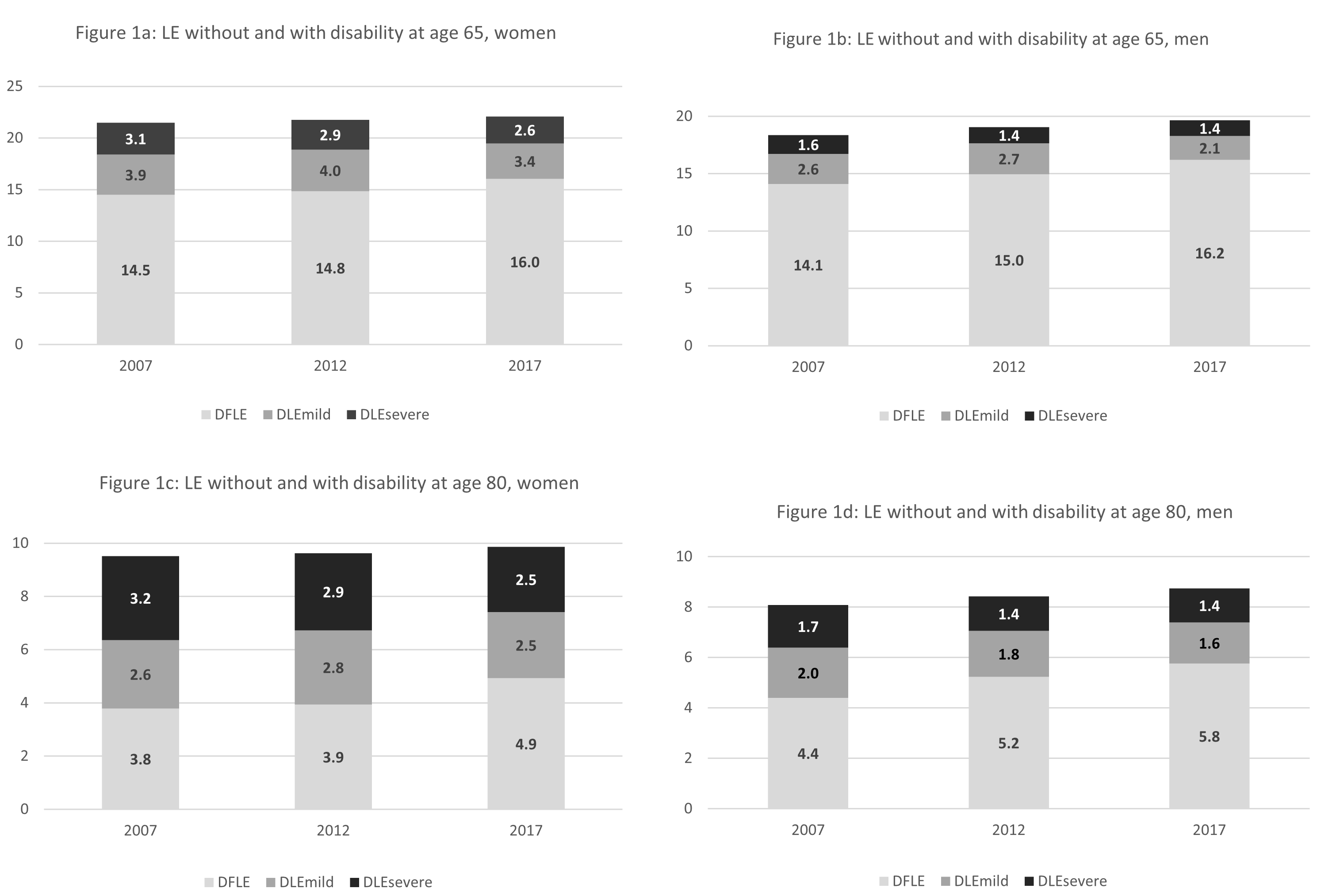 Similar to other studies on disability-free life expectancy and life expectancy with disability, this work has some limitations. First, the estimates are based on self-reported as opposed to observed disability. However, the use of the same question for each of the three waves under study makes any systematic bias unlikely. Then, even though Sullivan’s method has been criticised because it relies on the prevalence rather than on the incidence of disability, it has been shown to produce estimates similar to those of more accurate multistate methods that rely on rarely available longitudinal data [20, 21]. Finally, the computation of life expectancy with mild disability as life expectancy minus disability-free life expectancy and life expectancy with severe disability relies on the assumption that functional status declines from no disability to mild and then severe disability, although some persons might experience a sudden onset of severe disability. However, this simplification does not affect the estimates of disability-free life expectancy or morbidity compression.