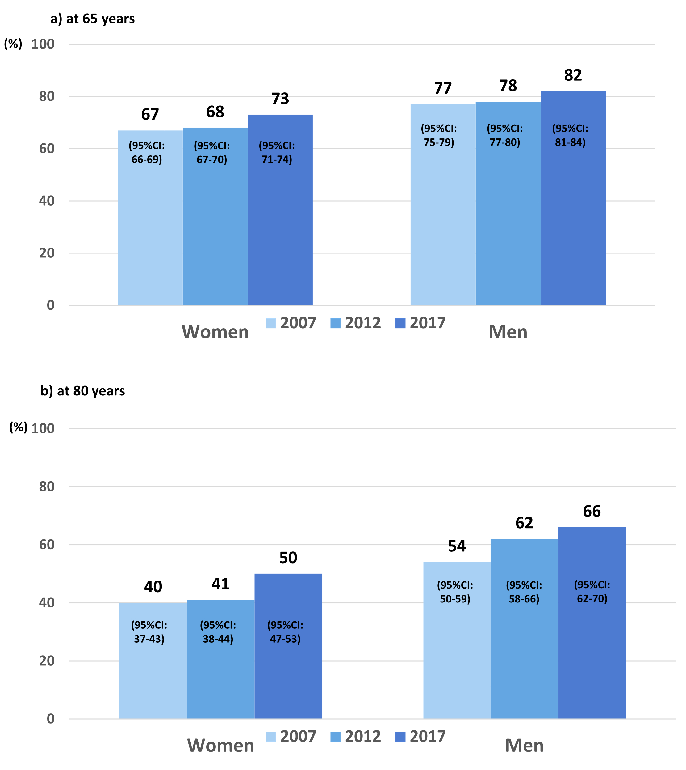 Despite the increase in life expectancy between 2007 and 2017, the combined result of the expansion of disability-free life expectancy and reduction in life expectancy with disability over the same period led to a significant increase in the proportion of disability-free life expectancy versus life expectancy in both sexes. At 65 years of age, this proportion increased from 67% (95% CI 66‒69) to 73% (95% CI 71‒74) in women, and from 77% (95% CI 75‒79) to 82% (95% CI 81‒84) in men (fig. 2a). At 80 years of age, the proportion of disability-free life expectancy versus life expectancy LE also significantly increased in both sexes, from 40% (95% CI 37‒43) to 50% (95% CI 47‒53) in women, and from 54% (95% CI 50‒59) to 66% (95% CI 62‒70) in men (fig. 2b).