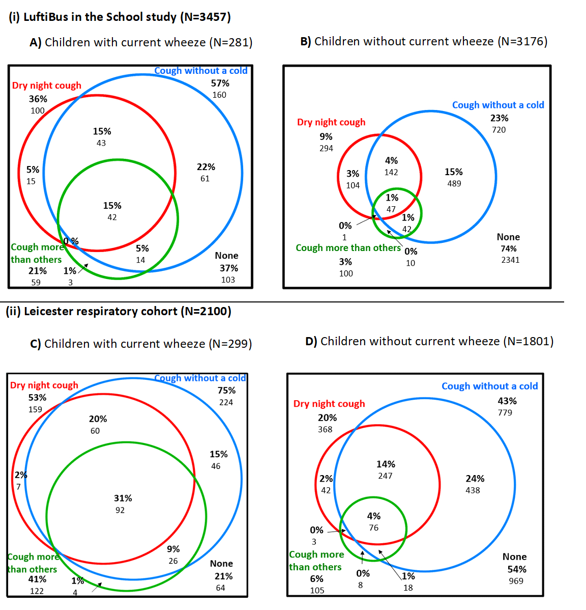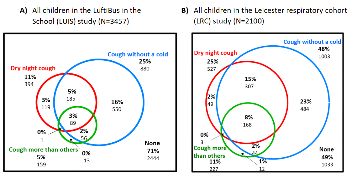 Figure 2 Venn diagram showing the overlap between parents’ answers to three different questions on cough in the LuftiBus in the school study and the Leicester Respiratory Cohort.