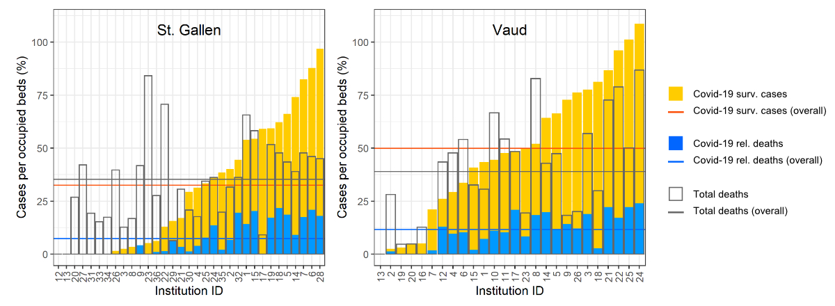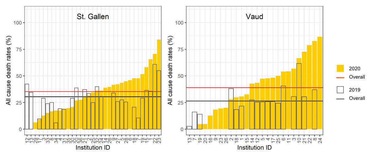 Figure 2 Total deaths per occupied bed in 2020 (yellow bars) and 2019 (blank bars) for (a) St. Gallen and (b) Vaud. Missing data: no bars indicate missing data in 2019 but no deaths in 2020.