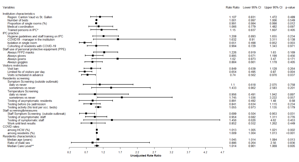 The univariable associations between selected variables and all-cause mortality are shown in figure 3. Among resident characteristics, higher all-cause mortality was associated with older age (RR = 1.05, 95% confidence interval [CI]: 1.01–1.08; p = 0.013) but not sex or higher care level. In the univariate analysis, higher COVID-19 rates both among residents (RR = 1.009, 95% CI: 1.004–1.013; p < 0.001) and healthcare workers (RR = 1.013, 95% CI: 1.005–1.021; p = 0.002) correlated with increased resident mortality. The proportion of single rooms was associated with lower mortality (RR = 0.991 per 1% increase, 95% CI: 0.984–0.998; p = 0.012) as were the following infection prevention and control practices: isolation of residents with COVID-19 in single rooms (RR = 0.65, 95% CI: 0.49–0.85; p = 0.003), screening of staff for COVID-19 symptoms (RR = 0.69, 95% CI: 0.50–0.95; p = 0.031), and regulation of visits such as limiting the number per day (RR = 0.65, 95% CI: 0.49–0.87; p = 0.004) or scheduling visits in advance (RR = 0.74, 95% CI: 0.56–0.97; p = 0.037).