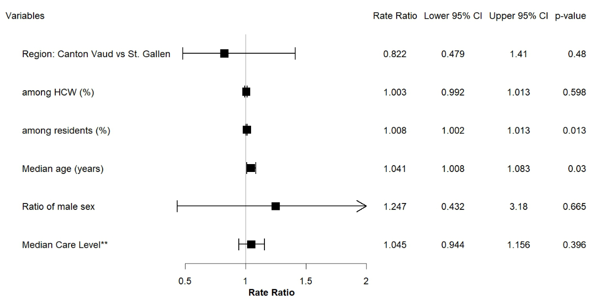 Residents’ age, sex, and care level were aggregated using the median per institution (for age and care level) or the percentage of males (for sex). We did not correct p-values for multiple testing. Rate ratios (RR) were interpreted as follows. The RR for continuous predictors represents the change in the outcome for a one-unit increase in the independent variable. The RR for factor variables represents the change in the outcome compared to the reference category (i.e. a RR of 2 means that the incidence rate of the respective group is twice the incidence rate of the reference group). All analyses were performed with the R statistical software (version 4.0.2).