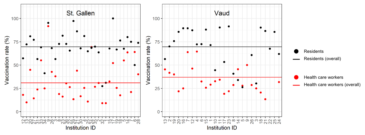While authorities imposed restrictive measures to mitigate the spread of SARS-CoV-2, such as restrictions on visits and social activities, evidence of their effectiveness remains limited. In most countries, including Switzerland, the vaccination of long-term care residents and their caring staff was among the COVID-19 vaccination campaign’s top priorities. However, in Switzerland, no systematic data on vaccination rates among residents or healthcare workers are available at an institutional or cantonal level.