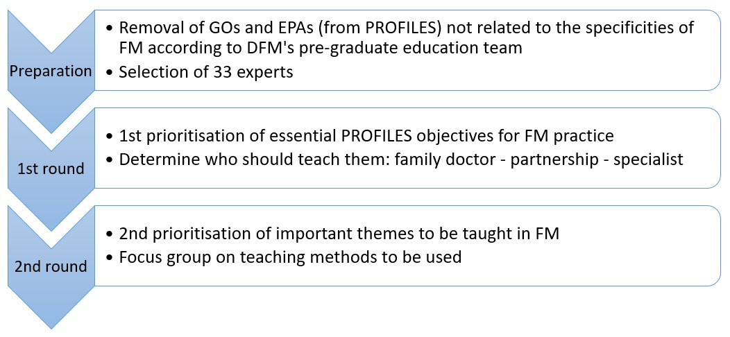 Indeed, in the context of implementing PROFILES at the Faculty of Biology and Medicine of the University of Lausanne, the Department of Family Medicine received a mandate to strengthen and adapt the teaching of family medicine. This directive forms the basis of our two objectives for remodelling family medicine teaching at the University of Lausanne: to determine the priority themes for teaching family medicine at the University of Lausanne and to collect expert opinions on the best ways of teaching family medicine. We further aimed to produce a coherent family medicine teaching programme encompassing the specificities of family medicine as well as the future challenges facing medicine in general, such as the management of chronic diseases, prevention and health promotion, the impacts of climate change on health and the integration of new models of care including interprofessional collaborative practice.