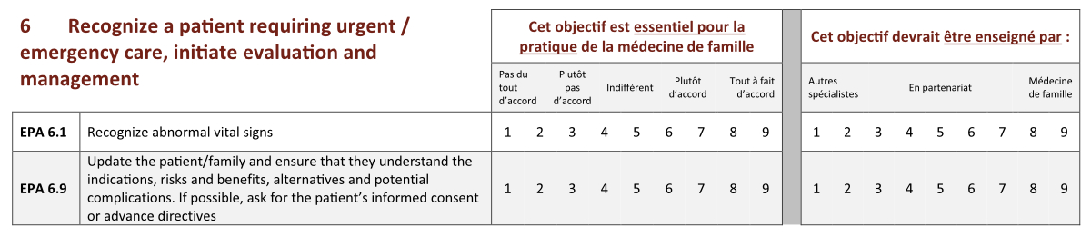 For the first round, we started with a questionnaire using the 67 general objectives (GOs) and 80 entrustable professional activities (EPAs) of PROFILES. We removed 17 GOs and 28 EPAs with no obvious link to the practice of family medicine (e.g. resuscitation of a newborn). Experts gave their opinion on the 92 remaining items (40 GOs and 52 EPAs) by answering the questionnaire received by mail and e-mail. For each item, the experts were asked to rate on a 9-point Likert scale whether they considered the item essential for family medicine practice and, if so, whether it should be taught by family doctors only, by family doctors in partnership with specialists or by other specialists only (figure 3).