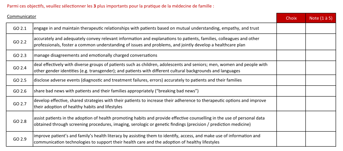 The survey was based on the following problem: the methods used by family medicine teachers and clinicians to teach family medicine had developed gradually and sporadically within the medical curriculum. Following a request for family medicine accreditation by the Lausanne Medical School in 2018, the certifying body felt that the current medical course was too focused on the practice of hospital medicine and in order to restructure the family medicine teaching curriculum, researchers and teachers of the Department of Medicine must set priorities for teaching family medicine in Lausanne.