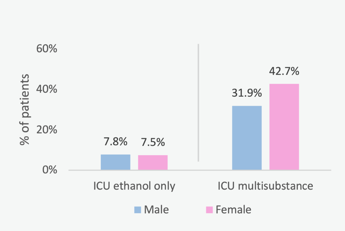 Gender differences in comorbidities, substance use and psychiatric ward referrals were highly evident for patients with ethanol intoxication who presented with multisubstance abuse. ICU transfers for patients with ethanol intoxication are substantial for both sexes, reflecting relevant disease burden and resource demand, as well as the need for further preventive efforts.