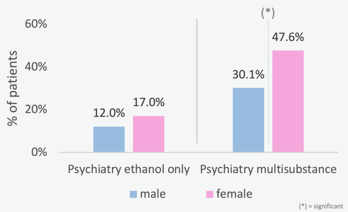 In the ethanol-only patients, the most common comorbidities were chronic ethanol abuse (47% males, 45% females; p = 0.789) followed by smoking (39% males, 42% females; p = 0.787) and psychiatric disorders (30% males, 36% females; p = 0.320). Liver diseases (13% males, 9% females; p = 0.299), lung diseases (11% males, 10% females; p = 1) and drug addiction (9% males, 10% females; p = 1) were also frequently found. Other comorbidities such as coronary heart disease, history of cancer or dementia were rare. There were no significant gender differences (table 1).