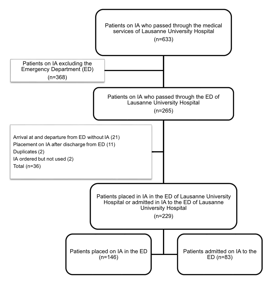 The Cantonal Medical Office of Vaud identified 633 cases of involuntary admission admitted to or issued from Lausanne University Hospital for the study period. From this list, 265 situations mentioned the emergency department. After analysis of these 265 patients, only 229 were considered for this study, the others not meeting the decision criteria for placement on involuntary admission in the emergency department and/or for admission on involuntary admission to the emergency department (figure 1). Among the patients on involuntary admission who were identified in the perimeter of the emergency department in 2018, a total of 83 were admitted on involuntary admission. This represents an incidence of 1.4 of 1000 emergency department admissions.