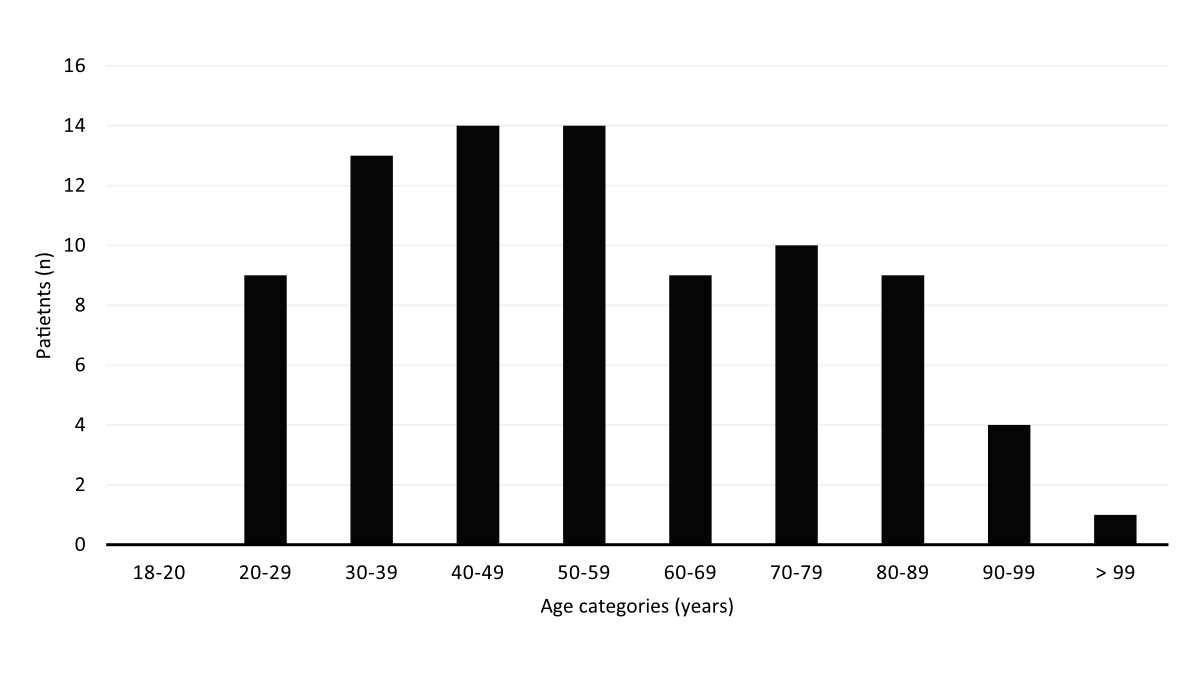 These patients had a mean age of 55 years (±20) (figure 2) and were predominantly male (58%, n = 48). Involuntary admissions were ordered mainly by an on-call physician (n = 38), an attending physician (n = 26), a psychiatrist (n = 5), or the APA (n = 3). The origins of the requests for involuntary admission are listed in table 1. Patients came principally from their home (61%) or had been brought in by the police after being found in the public domain (20%). Institutions (home for senior citizens, sheltered accommodation, boarding house) represented the third most frequent source, with 13% of patients. Other patients came from prisons (3%) and hospitals (3%). Regarding the documentation of involuntary admission, the initial form was available in the hospital electronic files in 47% of cases (n = 39). For patients with an available form (n = 39), most of the reasons given for involuntary hospitalisation were mental disorders (74%, n = 29). A serious state of neglect was invoked in 23% (n = 9) of situations. Lastly, mental deficiency was cited for 10% of people being put on involuntary admission. In four situations, a combination of these three reasons was stated for the same placement on involuntary admission (two reasons in three cases, three reasons in one case). In 64% (n = 25) of these involuntary admissions, the file mentioned that relatives and legal/therapeutic representatives, or both, had been made aware of the decision.