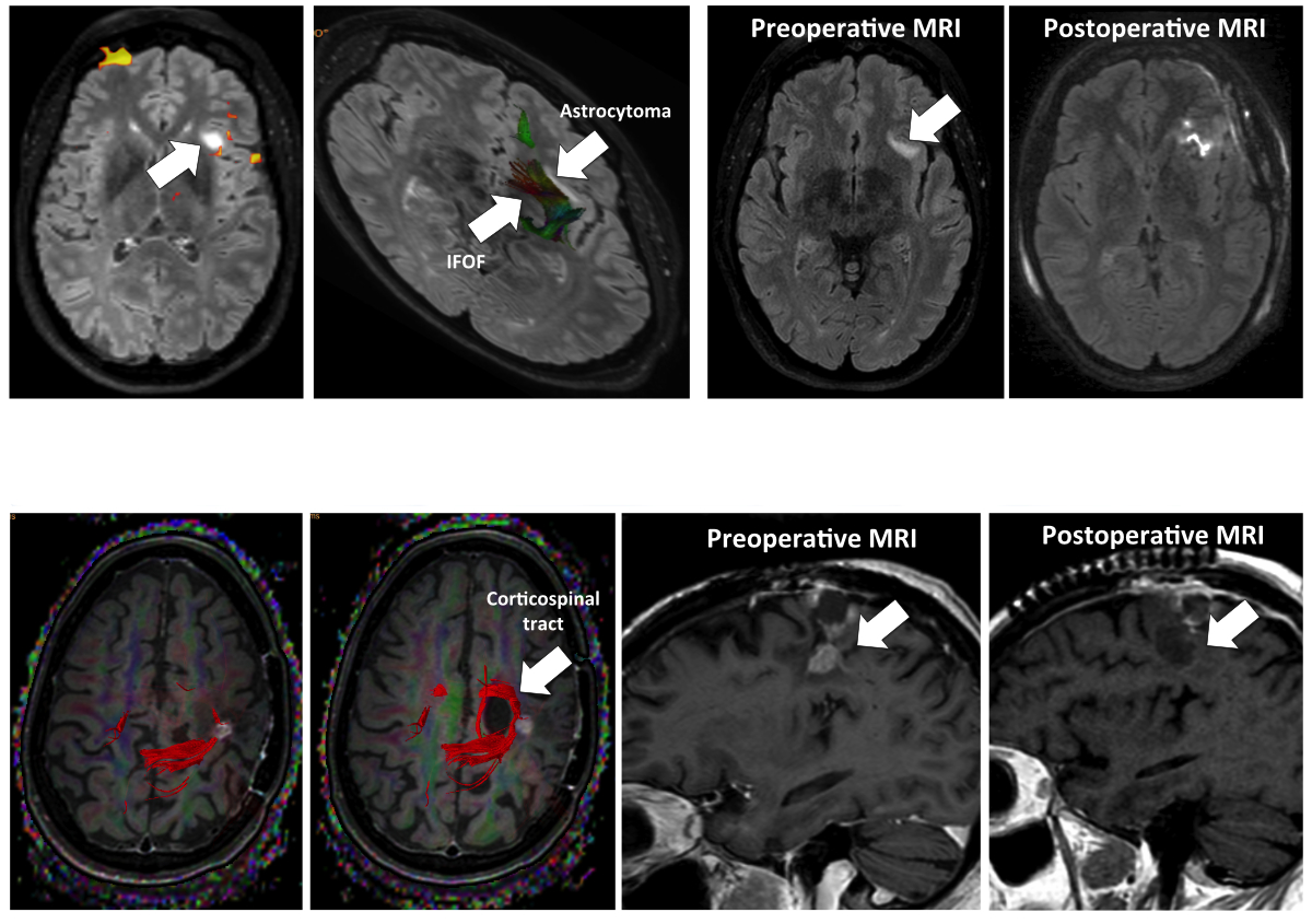 Clinical assessment was performed by a board-certified neurosurgeon preoperatively and at 3, 6, and 12 months postoperatively using the Karnofsky performance score (KPS). The neuropsychological exam was performed by a specialized neuropsychologist (co-author OS) for patients' task-based functional MRI (fMRI) to check for their dominant hemisphere. Complementary diffusion tensor imaging by fibre tracking (DTI) was performed to evaluate the position of major fascicles including, but not limited to, the corticospinal tract, arcuate fasciculus, inferior fronto-occipital fasciculus (IFOF), and arcuate fasciculus (AF) [28]. Postoperative MRI was usually performed within the first 48 hours after surgery and at 3 and 6 months.