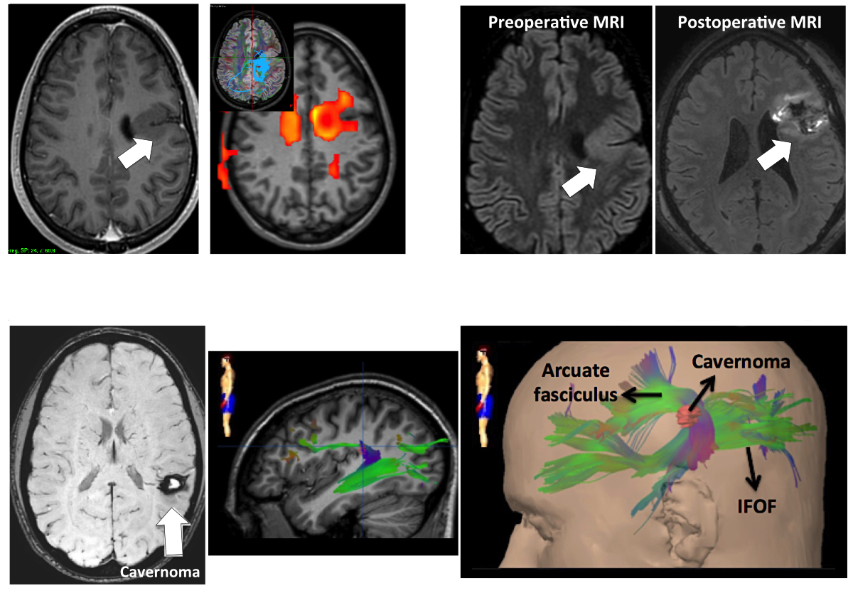 Figure 2 Illustrative cases benefiting from the combined use of awake surgery and intraoperative MRI. Case 3: Cortical dysplasia, with structural T1 preoperative MRI (left), functional task-based fMRI showing that the lesion is in contact with premotor and motor areas of the hand (center) and diffusion tensor imaging showing the motor tract (in blue, left). Case 4: cavernous malformation, located at the junction between the inferior parietal and the posterior temporal lobe (Wernicke area).