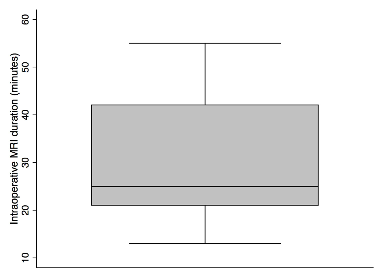 The interruption time due to the intraoperative MRI is usually small, around 30 minutes (15 minutes couch in, 15 minutes couch out).