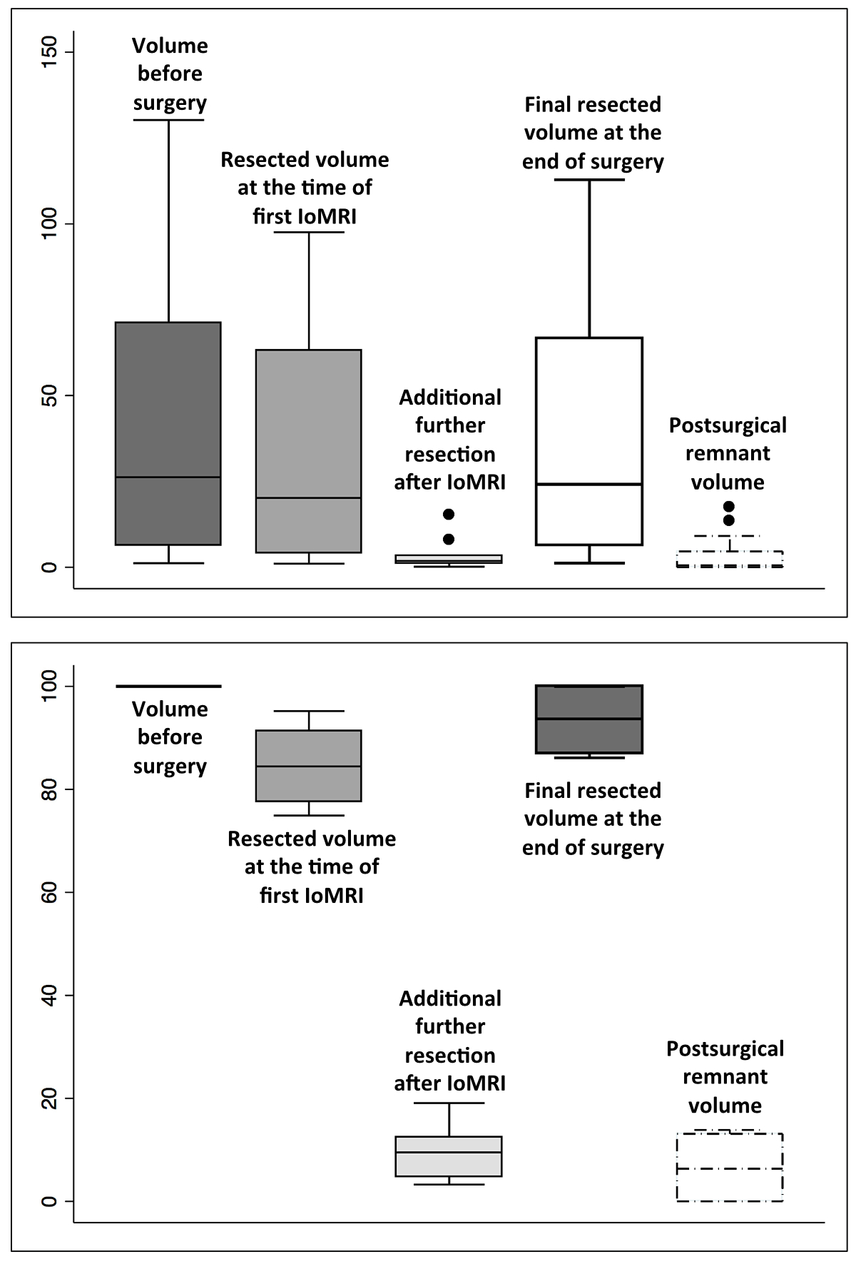 Figure 4 The impact of intraoperative MRI on the microsurgical resection in terms of volumes (as cc, upper side; as percentages, lower side).
