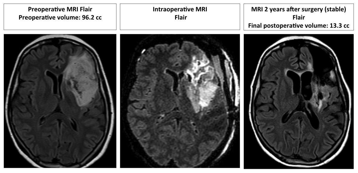 | #2 intraoperative MRI | M | 37.7 | L | Fronto-temporo-insular | Partial seizures | None | Oligoastrocytoma WHO II (diagnosed on biopsy 7 y before with further chemotherapy) | Surgery 21.6 months later (epilepsy & volumetric progression) | 36 |