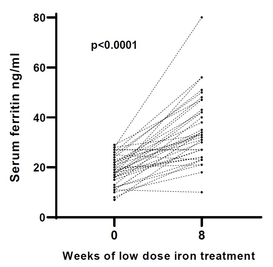 The study consisted of two visits after enrolment (baseline and follow-up visit) and there was no control group. At both visits, participants were fasting, vital signs were measured, and a blood sample was obtained for the determination of serum ferritin, haemoglobin, C-reactive protein (CRP), and plasma hepcidin. At baseline, we rechecked for concomitant medications, asked about the occurrence of any adverse events since the screening visit and distributed the iron supplement; two boxes containing sixty 6 mg for a total of 120 coated tablets of elemental iron (corresponding to 18.6 mg dried iron sulphate, produced by Streuli Pharma AG, 8730 Uznach, Switzerland). The participants were asked to take two tablets per day, one in the morning and one in the evening, 60 minutes before or after a meal for eight weeks. Since there were no visits during the eight-week intervention, the participants were contacted every two weeks by telephone, mail, or online messages to monitor compliance and ask about any adverse events. The data were obtained from 36 participants in 2 visits, with the first visit being the baseline and the second visit after 8 weeks of taking the study medication. At the follow-up visit, the participants were asked about adverse events and the remaining iron supplements were counted as a further measure of compliance. Any change in their general health status was assessed eight weeks after treatment initiation by asking participants to categorise their current health status compared to the baseline visit: improved (much or moderately), unchanged, or worsened (little, moderately, or much) (adapted from Anker et al. [22]).