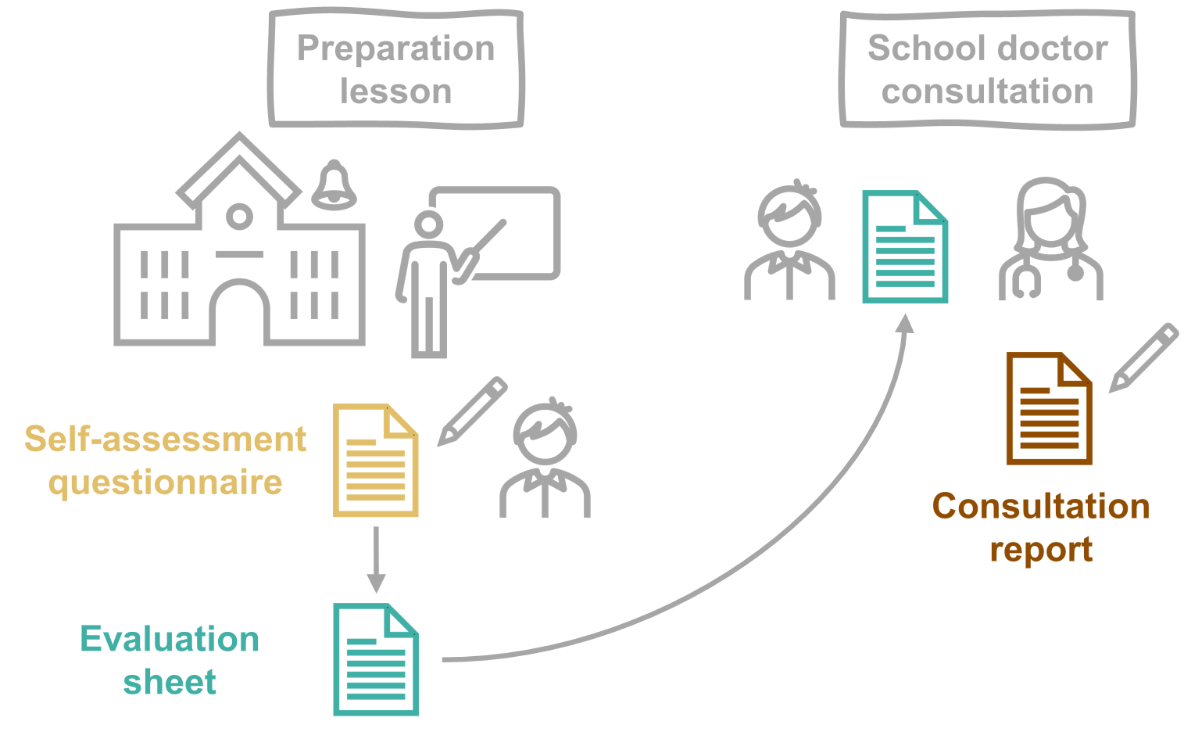 Figure 1Overview of the process. During the preparation lesson, the students fill out a “self-assessment questionnaire”. The answers are transferred to an “evaluation sheet” which is brought to the school doctor consultation and serves as a basis for the conversation. Afterwards, the school doctors tick off the health topics addressed on the “consultation report”.