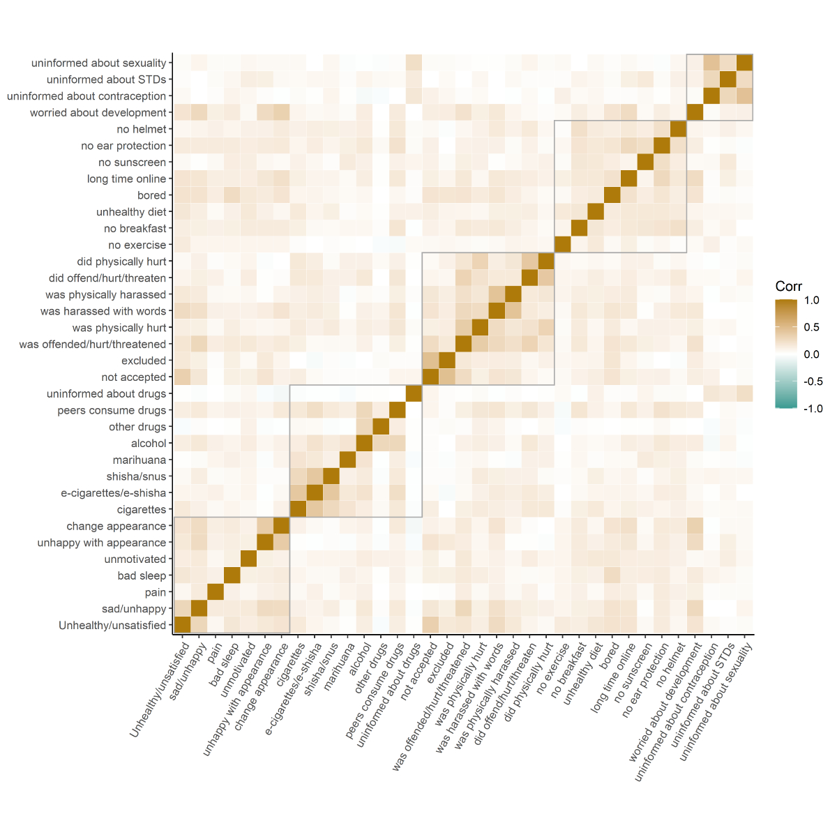 There was a clear correlation between different questions within the same overarching health topic (figure S1 in the appendix). Apart from that, the highest correlation was observed between feeling sad/unhappy or unhealthy/unsatisfied and not feeling accepted, having been seriously offended/hurt/threatened, having been sexually harassed with words, or worrying about one’s physical development, as well as between worrying about one’s physical development and being unhappy about or wanting to change something about one’s appearance. There was hardly any negative correlation, that is, an unfavourable response to one question correlating with a favourable response to another question.