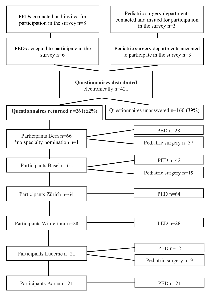An observational, cross-sectional, multicentre, survey-based study was conducted in three tertiary PEDs (Bern, Basel, Zurich), three rural PEDs (Winterthur, Lucerne, Aarau), and three tertiary paediatric surgery departments (Bern, Basel, Lucerne) in German-speaking Switzerland.