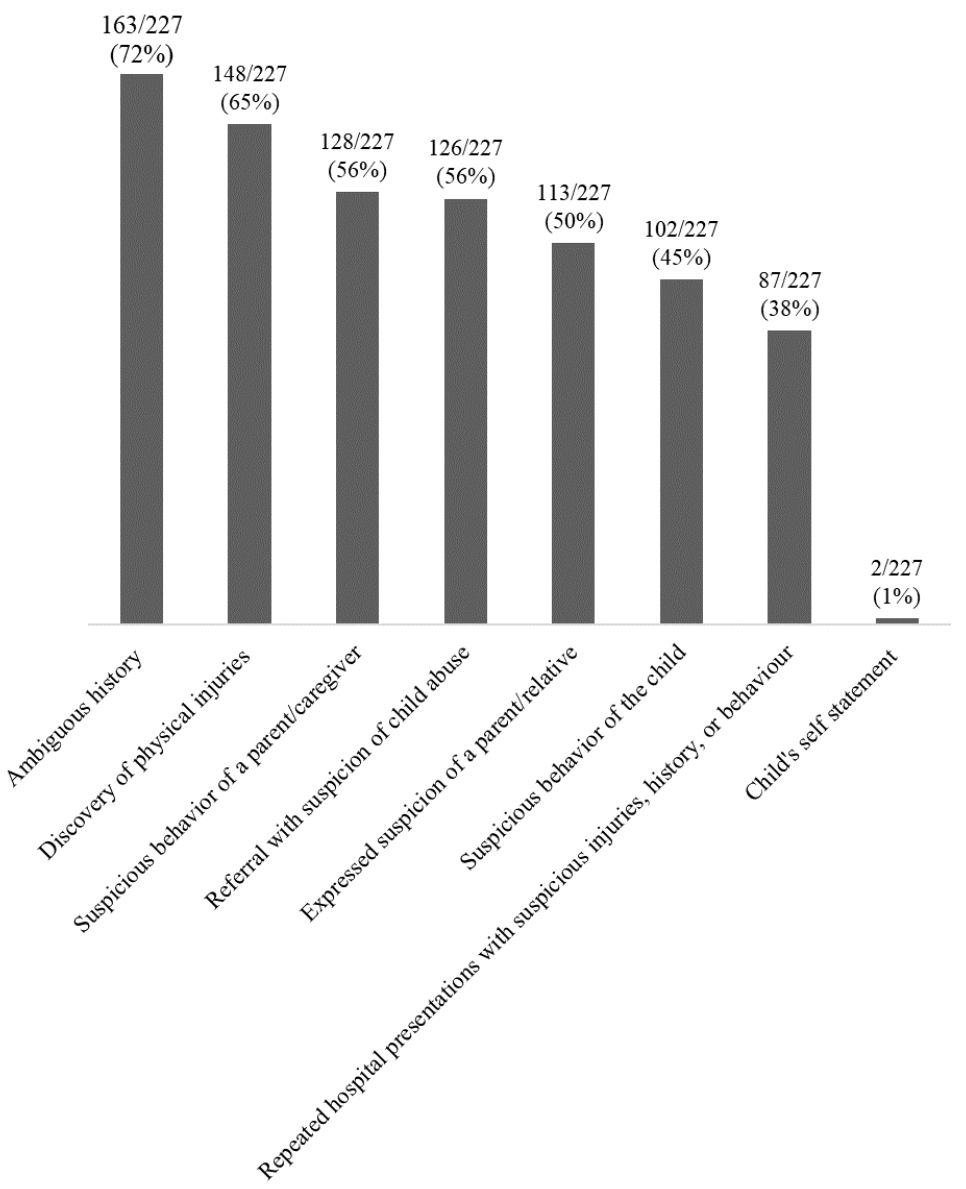 27. Diderich HM, Verkerk PH, Oudesluys-Murphy AM, Dechesne M, Buitendijk SE, Fekkes M. Missed cases in the detection of child abuse based on parental characteristics in the emergency department (the Hague Protocol).J Emerg Nurs.2015 Jan;41(1):65–8.