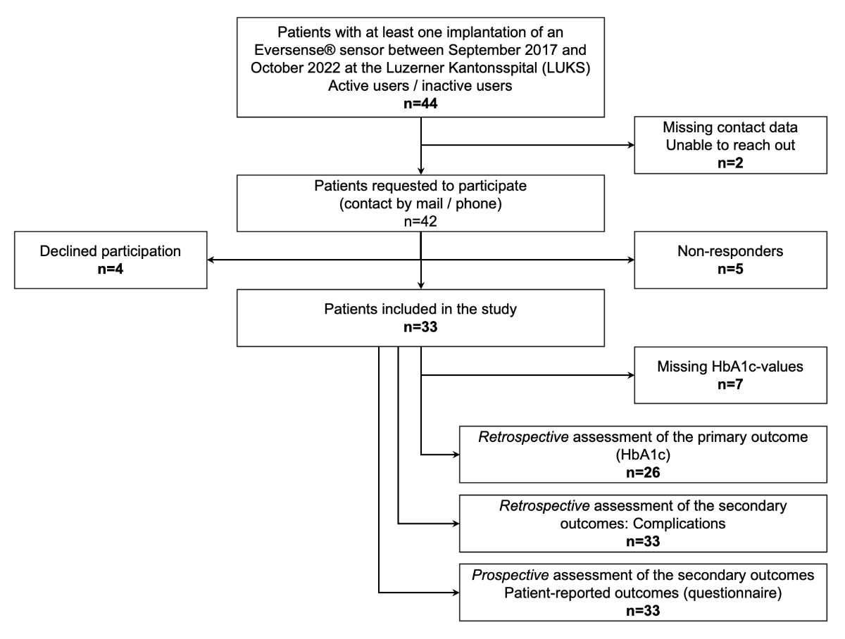 This study aimed to investigate the effectiveness and safety of the Eversense® CGM System at a large diabetes centre (Luzerner Kantonsspital; LUKS) in terms of HbA1c change and safety issues in a clinical setting with a prolonged follow-up. Compared to other CGMSs and FGMSs, the Eversense® system initially requires more effort to become operational (a minor surgical procedure for implantation of the sensor every 6 months). Therefore, a special interest in this study relied on patient-reported outcomes assessed with a study-specific questionnaire.