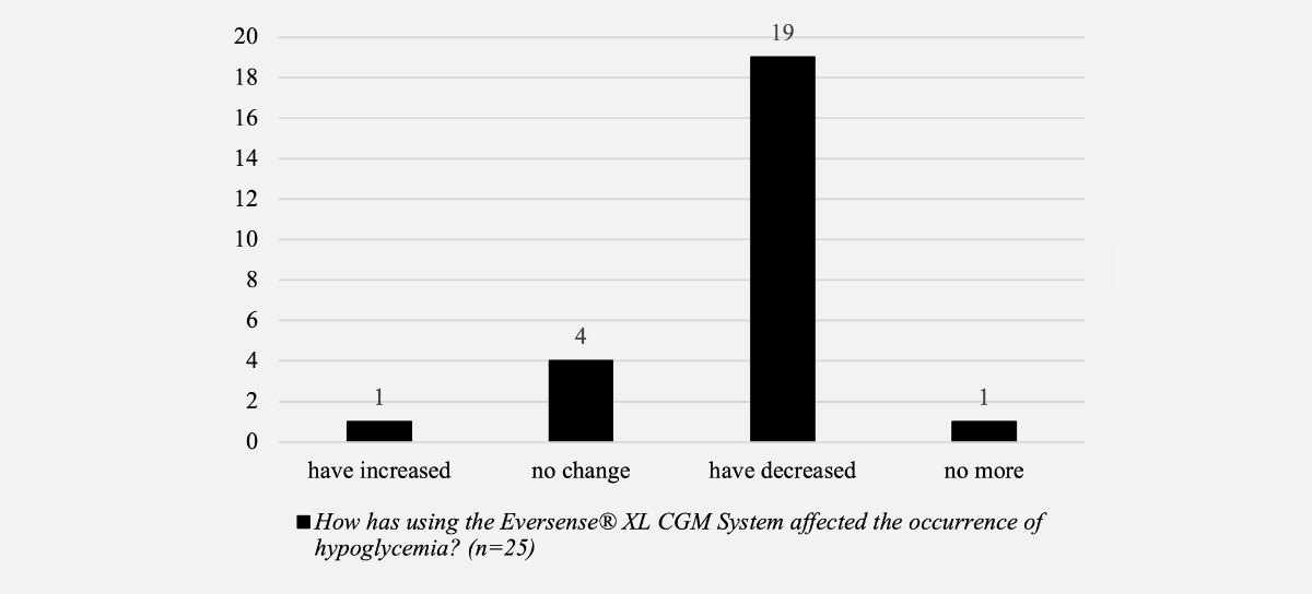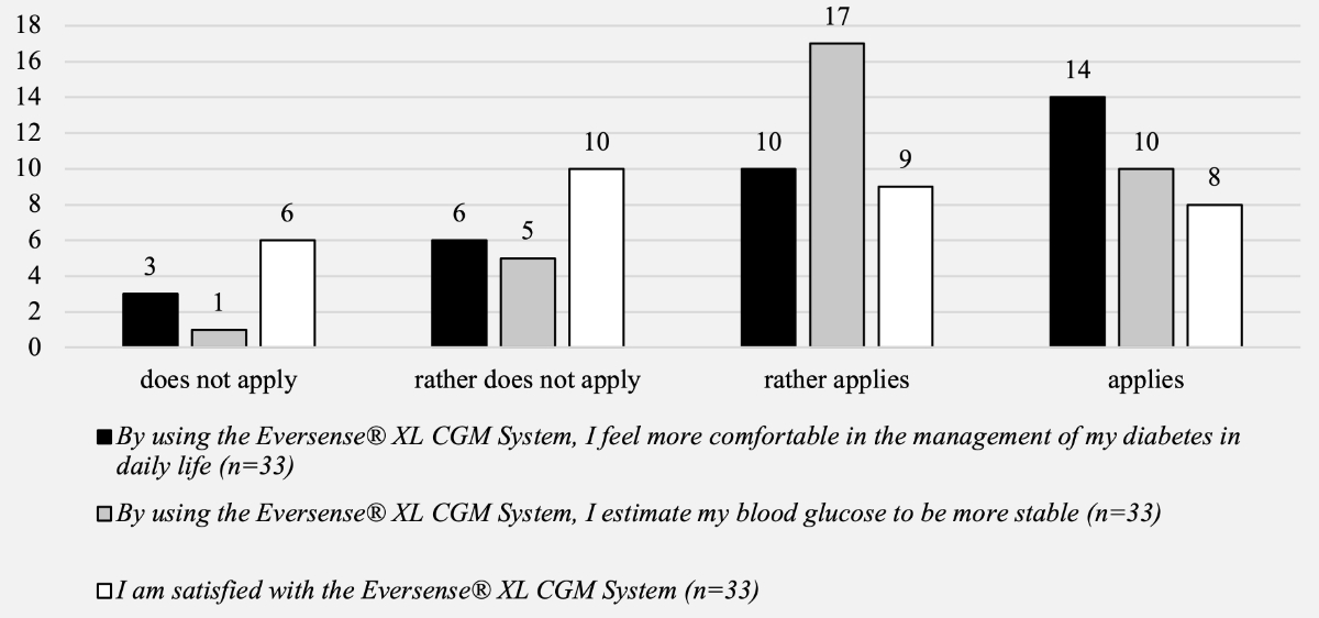 Most patients found that their diabetes management had improved by using the Eversense® System and estimated that their glucose values were more stable. More than half of the patients (17/33, 52%) were generally satisfied with the device (figure 2).