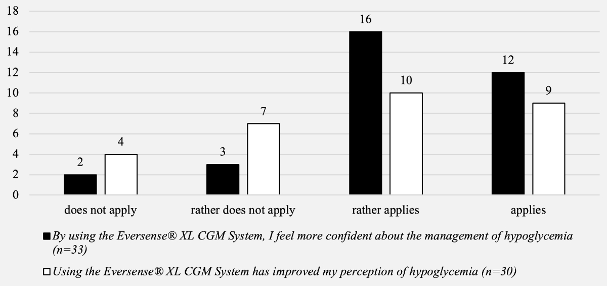The second part of the study investigated patient-reported outcomes with a questionnaire specifically developed for this investigation. The questionnaire showed that the majority of patients reported subjectively better HbA1c levels, and more stable glucose values throughout the day and that the Eversense® CGM System led to a better management of the disease. Additionally, patients had a better perception of hypoglycaemia, had fewer hypoglycaemic events and felt more confident in managing hypoglycaemia when using the CGMS. This agrees with other data regarding the quality of life of CGMS users [14].