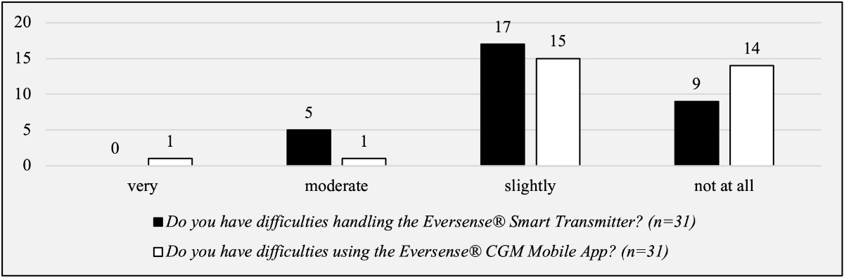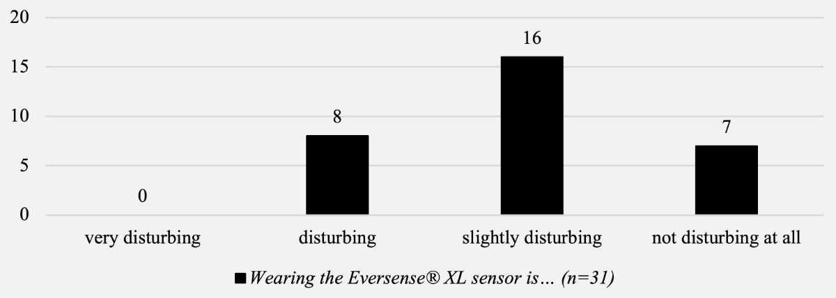 Questions focused on the handling of the device showed that on average, patients only had slight to no difficulties with the Eversense®Smart Transmitter (84%) and the Eversense® CGM Mobile App (94%; figure 5). Of the patients, 16/31 (52%) found wearing the sensor a slight disturbance, whereas 7/31 patients (23%) found it not disturbing at all (figure 6).