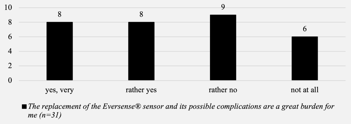 Most patients felt that the replacement procedure for the Eversense®sensor was a burden for them. Eight (26%) felt that the change was a great burden for them, and only six (19%) felt that the change was not a burden for them at all (figure 7).