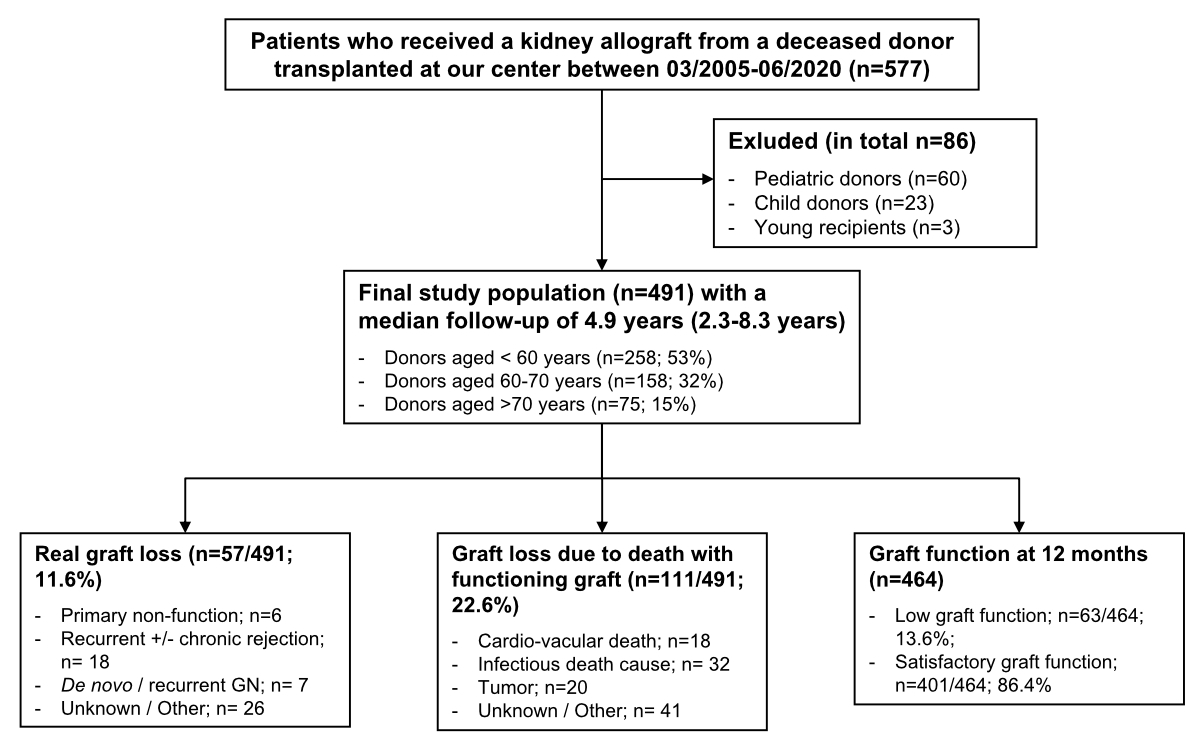 This retrospective study was performed with the approval of the ethics committee of Northwestern and Central Switzerland (www.eknz.ch; project-ID 2021-01475). Patients from a prospective, observational renal transplant cohort, who were transplanted at our centre between March 2005 and June 2020 were selected for the study. We took advantage of a cohort that had prospective risk stratification, with an adaptation of the induction regimen, and received contemporary maintenance immunosuppression consisting of tacrolimus (Tac) and mycophenolate acid (MPA). Inclusion criteria were a kidney transplantation from a deceased adult donor and a minimum follow-up period of 1-year posttransplant. Exclusion criteria were living donor transplantations, combined transplantations, and donor/recipients aged <18 years at the time of transplantation. Briefly, between March 2005 and June 2020, 577 patients received a kidney allograft from a deceased donor at our centre. Of those, n = 60 were from paediatric donors (aged less than 5 years), n = 23 were from child donors (aged between 5 and 17 years), and n = 3 recipients were under 18 years of age at the time of transplantation, and were therefore excluded. The final study population consisted of n = 491 adult recipients of deceased donor kidney transplantations. Outcomes were evaluated until September 13, 2021 (figure 1).