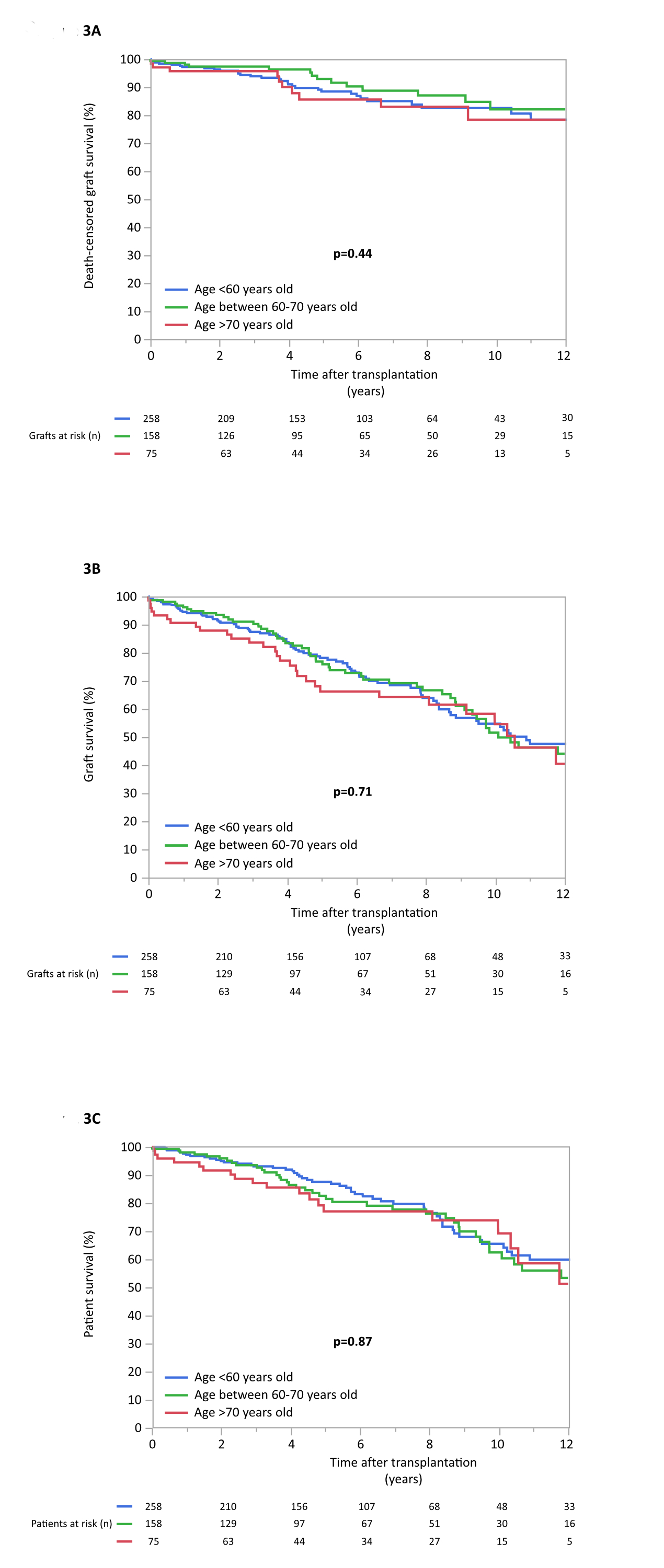 Kaplan-Meier analysis on kidney allograft recipients stratified by donor age demonstrated that death-censored graft survival, as well as graft and patient survival, did not differ across the age groups (figure 3A–C). Specifically, 3-year and 5-year death-censored graft survival in the very old donor group was 96% and 86%, respectively, and did not significantly differ from the other two age groups (p = 0.44; figure 3A). As expected, 3-year and 5-year graft survival, which was mainly triggered by events of death with a functioning graft, was lower compared to death-censored graft loss, but did not differ statistically across all age groups (p = 0.71; figure 3B). Specifically, 3-year and 5-year graft survival in the very old donor group was 84% and 66%, respectively (figure 3B). In addition, 3-year and 5-year patient survival in the very old donor group was 87% and 77%, respectively, and did not differ significantly from the other two age groups (p = 0.87; figure 3C).