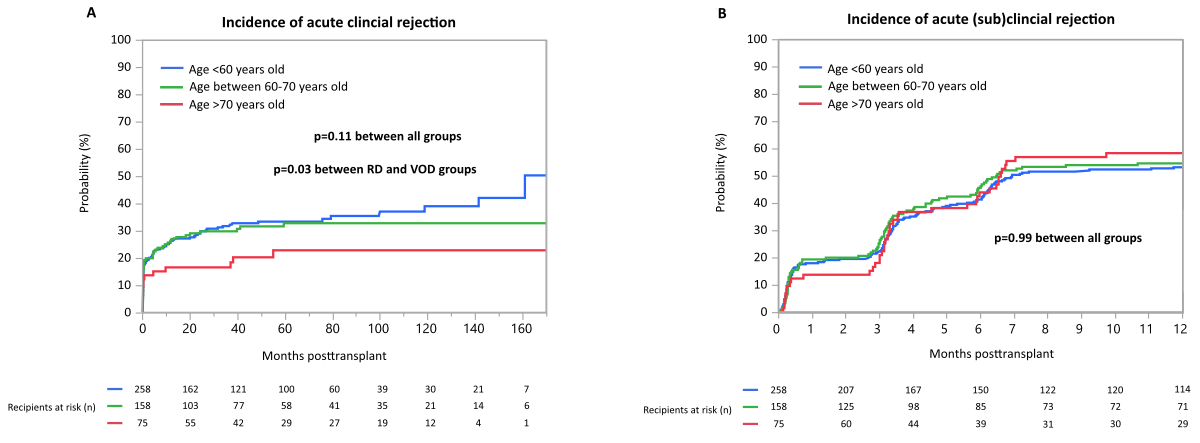 (Sub)clinical T-cell-mediated rejection occurred in n = 205 patients (42%), and (sub)clinical antibody-mediated rejection occurred in n = 98 patients (20%). Time-to-event analysis demonstrated no difference, either in the occurrence of T-cell-mediated rejection between the groups stratified by donor age (p = 0.62; supplementary figure S2A), or in the occurrence of any antibody-mediated rejection between the groups (p = 0.15; supplementary figure S2B).