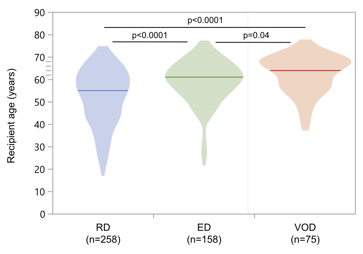 Figure S1At the time of transplantation, recipients of very old donor grafts were older (VOD; median age 64 years; IQR 57–69 years) compared to recipients of elderly donor grafts (ED; median 61 years; IQR 54–66 years) and regular donor grafts (RD; median 55 years; IQR 44–62 years). IQR: interquartile range