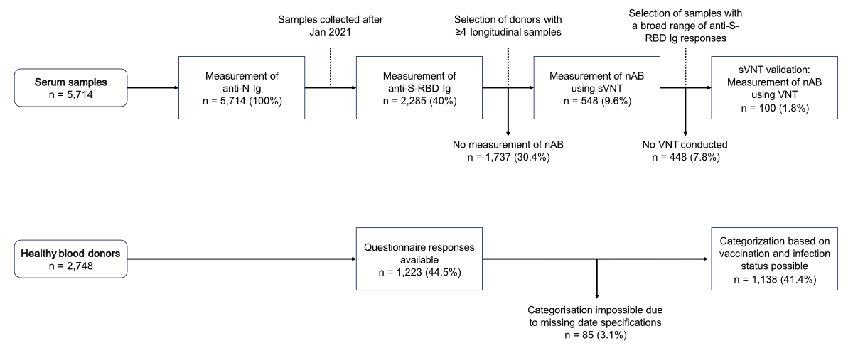 Figure 1Overview of the subsampling criteria and the numbers of samples or healthy blood donors included in the different analyses. The upper part shows the subsampling criteria and the number of samples in the different subsets for the various analyses. The lower part summarises the questionnaire responses and the vaccination and infection status categorisation results. anti-N: anti-SARS-CoV-2 nucleocapsid protein; anti-S-RBD: anti-SARS-CoV-2 spike glycoprotein receptor binding domain; Ig: immunoglobulin; sVNT: surrogate virus neutralisation test; nAb: neutralising antibodies; VNT: classical virus neutralisation test.