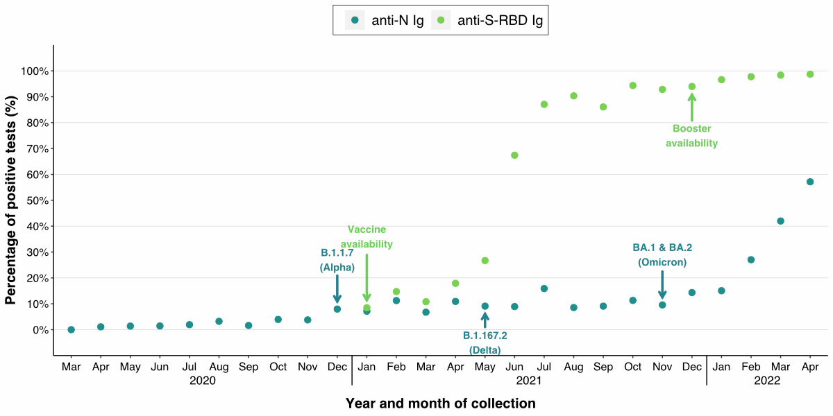 One approach is monitoring humoral immunity using antibodies against SARS-CoV-2 and neutralising antibodies (nAb). Among the four structural proteins of SARS-CoV-2, the most immunogenic sites are the Nucleocapsid (N) protein and surface Spike glycoprotein (S) [2]. Previous work has shown that humoral immunity after infection mainly consists of anti-N and anti-S immunoglobulins (Ig). However, vaccines have mainly been designed against the S protein [3]. Therefore, anti-S and anti-S receptor binding domain (RBD) Ig seropositivity alone serves as a vaccination indicator. In contrast, anti-N Ig seropositivity can be used as a proxy for infection. Among the range of antibodies against the S protein, nAbs neutralise the virus’ ability to enter and infect new host cells by blocking the viral RBD [4]. Therefore, neutralising antibodies are considered to correlate with protection from SARS-CoV-2 infections [5, 6].