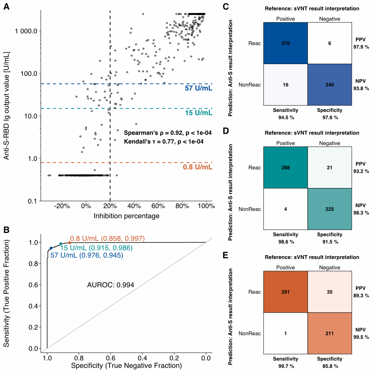 Figure 4Correlation analysis of Elecsys® Anti-SARS-CoV-2 S results vs wild-type SARS-CoV-2 surrogate virus neutralisation test (sVNT) results. A The anti-S-RBD Ig output values plotted against the inhibition percentages (i.e. the sVNT results), where each dot represents a serum sample. The black vertical dashed line denotes the cut-off for the presence of neutralising antibodies (nAb) at 20% inhibition, as measured in the sVNT. The orange (0.8 U/ml) and teal (15 U/ml) dashed lines denote the cut-off for anti-S-RBD Ig reactivity and nAb presence, respectively. The blue (57 U/ml) dashed line denotes the anti-S-RBD Ig output value at the highest Youden’s index. Spearman’s ρ and Kendall’s τ were calculated. B The receiver operating characteristic curve and calculated AUROC. The orange, teal, and blue points represent the abovementioned cut-offs and their respective specificity and sensitivity values are shown in brackets. Confusion matrices were plotted for the cut-offs (C) 57 U/ml, (D) 15 U/ml, and (E) 0.8 U/ml. anti-S-RBD Ig: anti SARS-CoV-2 spike receptor binding domain immunoglobulins; AUROC: area under the receiver operating characteristic curve; ROC: receiver operating characteristic; Reac: reactive for anti-S-RBD Ig; NonReac: non-reactive for anti-S-RBD Ig; PPV: positive predictive value; NPV: negative predictive value; anti-S-RBD: anti-SARS-CoV-2 spike glycoprotein receptor binding domain.
