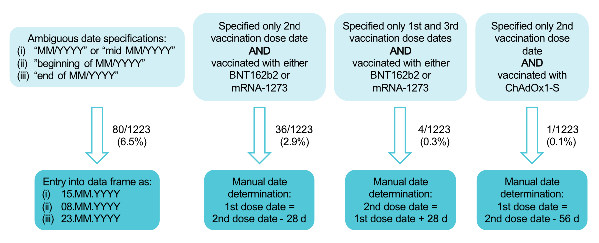 Figure S1Schematic of the manual determination of infection and vaccination dates. The upper light blue boxes describe the conditions that must be met for manual date determination. The bottom dark blue boxes represent the method for manually determining the date for each condition. The values next to the arrows represent the frequency at which the specific type of manual date determination was conducted. Median dates were selected for cases with ambiguous date specifications (leftmost column) to minimise errors. Specific date intervals were chosen based on the standard vaccination scheme of the different vaccines (three columns on the right).