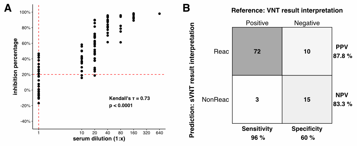 Figure S2Correlation analysis: classical virus neutralisation test (VNT) vs surrogate virus neutralisation test (sVNT). Tested with Wuhan wild-type SARS-CoV-2 in TMPRSS2-expressing Vero E6 cells and SARS-CoV-2 Neutralizing Antibodies Detection Kit (Adipogen™). A The x-axis shows the classical VNT results (i.e. the highest serum dilution at which the serum still protected against the virus). All samples that did not show live virus neutralisation at the lowest dilution tested were assigned the value 1. The y-axis shows the sVNT results (i.e. the calculated inhibition percentages). The points represent each serum sample. Kendall’s tau (τ) and the p-value were computed. The red dotted lines denote the respective methods’ cut-off for neutralising activity. B The confusion matrix. Samples were classified as positive for neutralising antibodies at an inhibition percentage ≥20% and a serum dilution of ≥1:10 for the sVNT and VNT, respectively. PPV: positive predictive value; NPV: negative predictive value.