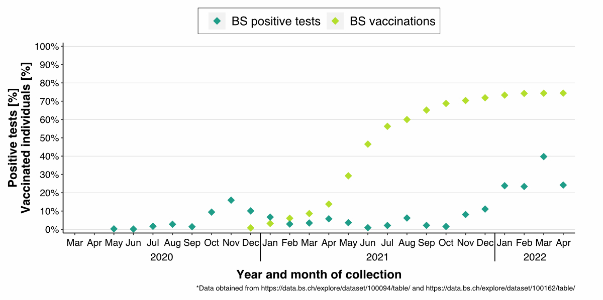 Figure S4The percentages of positive SARS-CoV-2 PCR and rapid antigen tests and vaccinated individuals in the canton of Basel Stadt, Switzerland, from March 2020 to April 2022. The percentages were calculated for each month. The blue squares represent the percentage of positive tests per month, and the green squares represent the percentage of vaccinated individuals (who received at least one dose of a vaccine against SARS-CoV-2).