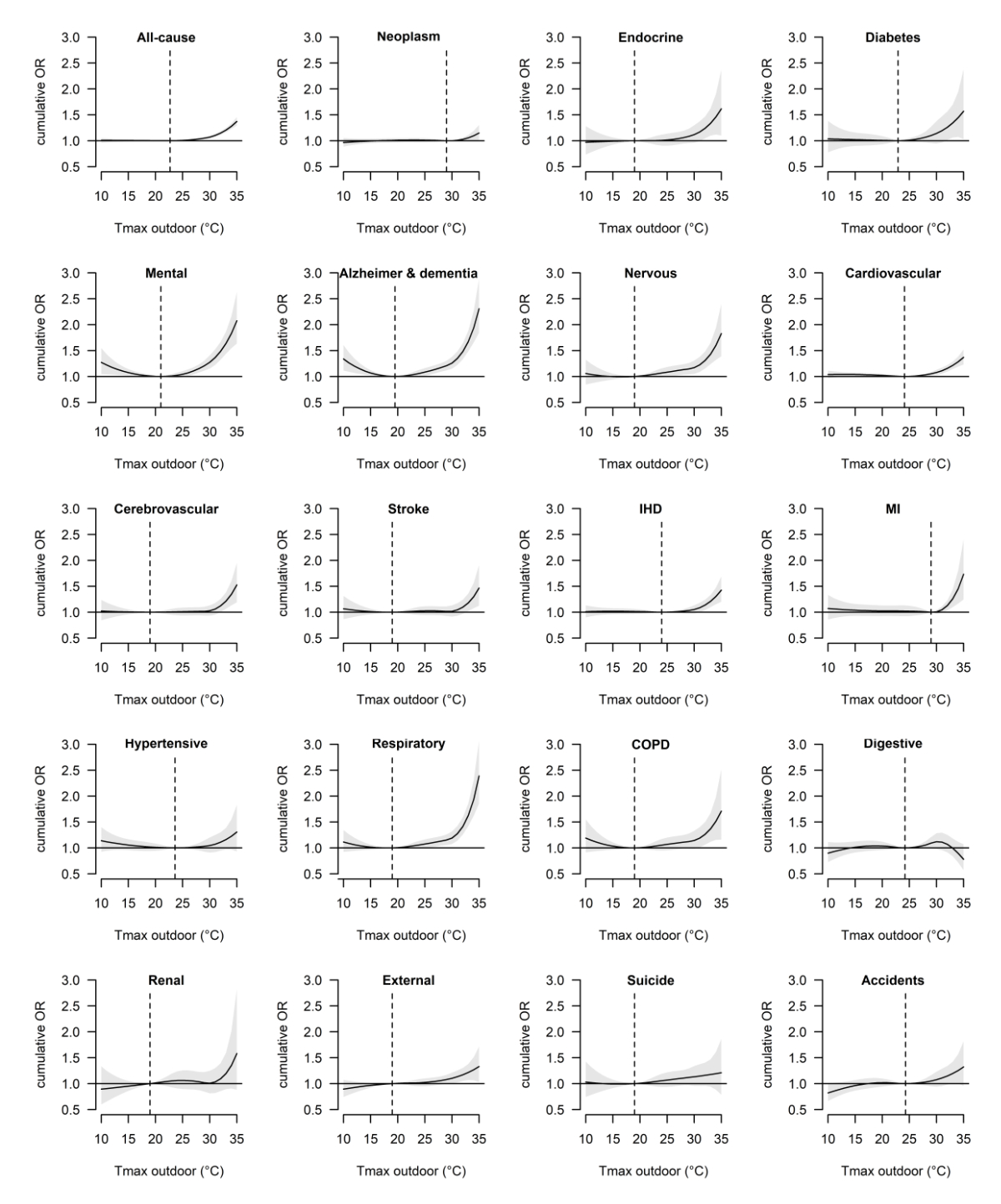 Overall cumulative exposure-response associations (with 95% confidence intervals) between outdoor daily maximum temperature (Tmax) and cause-specific mortality along 7 days of lag in Switzerland during the warm seasons (May to September) of 2003–2016. The dashed vertical lines indicate the cause-specific minimum mortality temperature. OR: odds ratio; IHD: ischaemic heart disease; MI: myocardial infarction; COPD: chronic obstructive pulmonary disease.