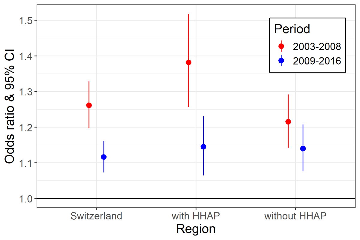 Cumulative odds ratios (ORs) with 95% confidence intervals (CIs) of heat-related all-cause mortality at region- and period-specific (2003–2008 versus 2009–2016) extreme outdoor daily maximum temperatures (Tmax) in Switzerland. Extreme temperatures are defined as the 98th percentile of the region- and period-specific Tmax. The region with heat-health action plans (HHAPs) covers cantons that implemented HHAPs between 2003 and 2008.