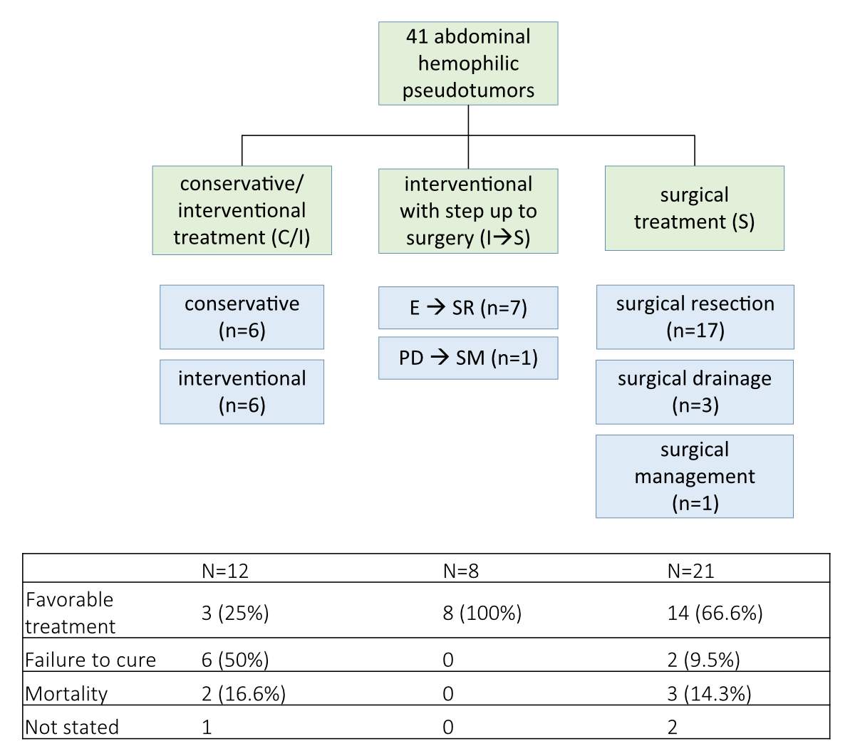 The abdominal haemophilic pseudotumour’s localisation was divided into “intraperitoneal” or “extraperitoneal” causing abdominal symptoms. Symptoms were defined as displacement of or adherence to abdominal organs without compromising organ function or as compression with a consecutive impact on organ function, fistulation, infiltration, abscess formation or bleeding (table 1). Treatment was divided into conservative or interventional alone, interventional treatment with step-up to surgery or primary surgical. Interventional therapy strategies were embolisation or percutaneous drainage of the haemophilic pseudotumour or local radiotherapy. Surgery was divided into “surgical resection”, including all surgical attempts to completely resect the haemophilic pseudotumour; “surgical management”, including surgical procedures to resolve complications due to the haemophilic pseudotumour without resecting the tumour; and “surgical drainage” (table 1). The outcome was considered “favourable” for patients with an improvement in symptoms and no early recurrence of haemophilic pseudotumour.