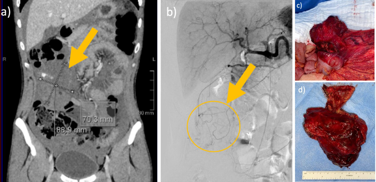 (a) Contrast CT venous phase with tumour 6.6 × 7.4 × 9.6 cm, (b) Angiography with no sign of active bleeding, (c) Intraoperative finding, (d) Resected specimen