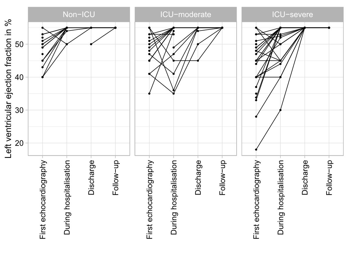 Figure 2Evolution of left ventricular systolic dysfunction over time, by disease severity. To make trends visible, we assigned a value of 55% (= normal) when a patient with left ventricular systolic dysfunction had recovered at the next echocardiography. (Non-ICU: child not admitted to the ICU; ICU-moderate: child admitted to the ICU without need for mechanical ventilation and/or inotropic support; ICU-severe: child admitted to the ICU with need for mechanical ventilation and/or inotropic support.) For discharged the closest echocardiography before discharge was used.