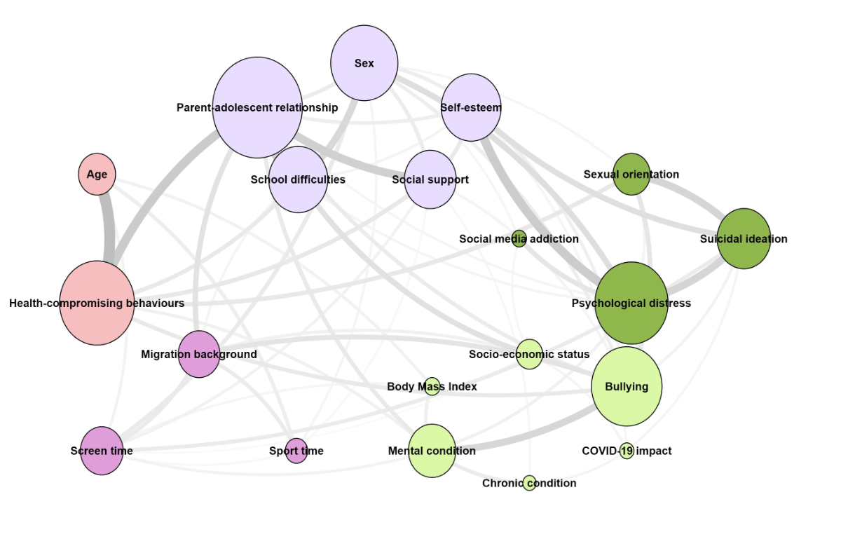 The factors contributing to suicidal ideation in adolescents are complex and multifaceted. Previous studies highlight various risk factors such as female sex, older age, depressive symptoms, loneliness or substance use [6], being a migrant [7], identifying as a sexual minority [8], being bullied and addictive use of social media [9]. Although various risk factors have been identified, suicidal ideation remains a multifaceted phenomenon that involves intricate interactions among psychological, social and biological factors. Therefore, it is essential to employ appropriate statistical tools to understand these complexities. One such tool is network analysis, a powerful statistical method that can be used to examine the interactions between multiple risk factors and their relationship with suicidal ideation, enabling the identification of the most influential factors and an understanding of their interplay [10, 11].