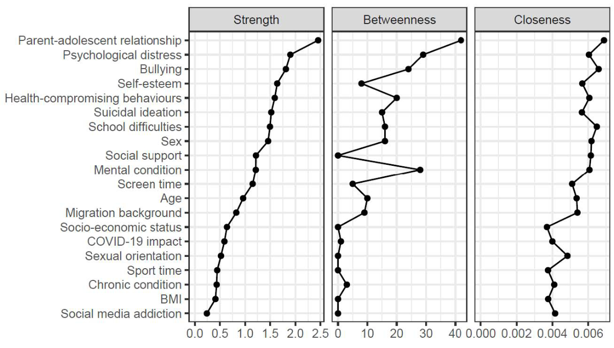 Figure S1Centrality plots of the network including suicidal ideation and related risk factors. Centrality measurements quantify the influence of nodes within a network. They estimate how central a node is given the network’s topology. Strength centrality measures the local influence of a node within a network. It is calculated as the sum of the absolute edge weights per node. In other words, it looks at the total weight of the edges coming into and out of a node. The nodes with the strongest strength centrality are parent-adolescent relationship, psychological distress and bullying, hence they have strong local influence on the overall network structure. Betweenness centrality is a measure of how often a node lies on the shortest path connecting any two other nodes, while normalising by the total number of possible paths between all other nodes. A node with high betweenness centrality is a bridge between different clusters of risk factors within the network. Parent-adolescent relationship, psychological distress and mental condition had the highest betweenness centrality measure. Closeness centrality is a measure of how close a node is to all other nodes in the network. It is calculated by averaging the shortest path length to all other nodes. A node with high closeness centrality indicates a node directly and indirectly well connected to all other nodes. Parent-adolescent relationship, bullying and school difficulties have the highest closeness centrality.