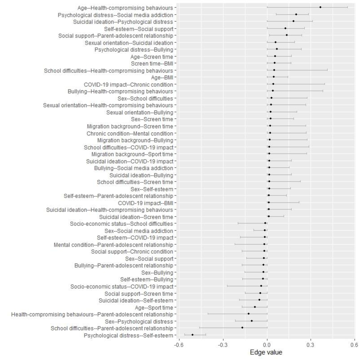 Figure S2Bootstrapping of robustness and edges of stability networks. The Least Absolute Shrinkage and Selection (LASSO) regularisation was used to identify important edges in the network. The edges that were not set to zero indicate that the edge is strong enough to be included in the network. This figure also shows the accuracy of the edge weights and allows for comparison of edges. However, it should be noted that the majority of the edges have overlapping confidence intervals, meaning that it is difficult to determine the order of the edge weights. Thus, we cannot claim that one edge value is significantly larger than another, except for the edge between psychological distress and self-esteem, which shows a significantly negative connection.